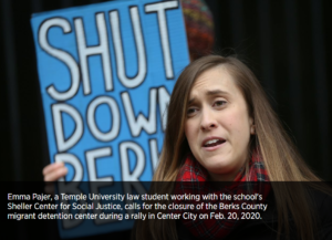 Today, the Social Justice Lawyering Clinic (SJLC) publishes In the Shadow of the Valley: The Unnecessary Confinement and Dehumanizing Conditions of People in Immigration Detention at Moshannon Valley Processing Center. This report is the first to comprehensively investigate conditions at Moshannon, the largest facility in the Northeast that detains immigrants who are awaiting the processing of their deportation cases. It is written by Cristina Isabel de Arana (’24), Alex Leone (‘25), and Bianca Taipe (’25), law students in the SJLC.